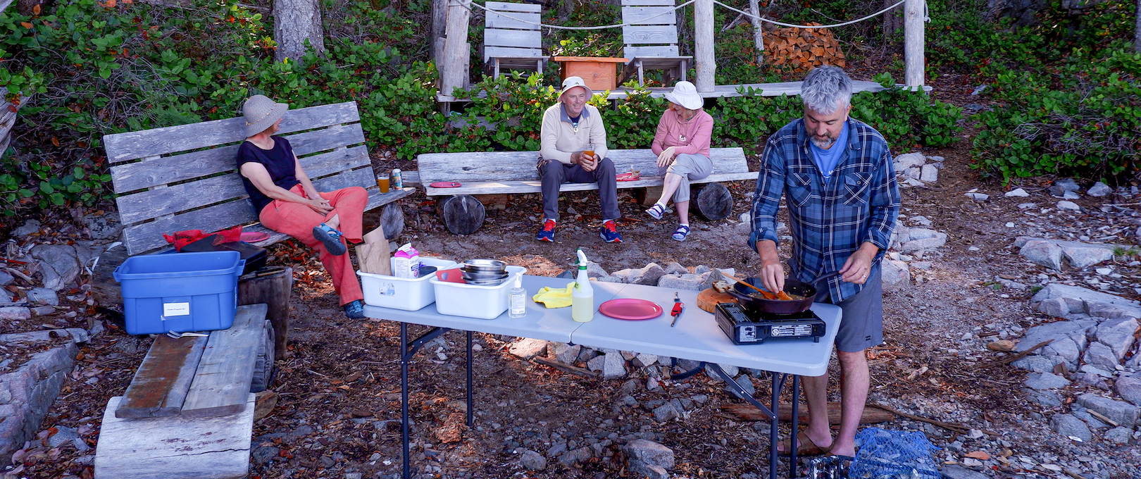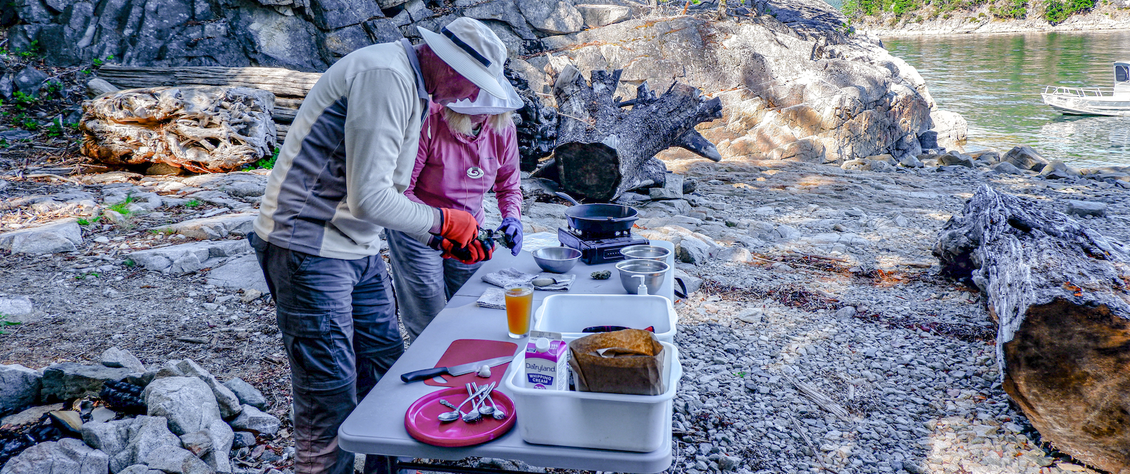 After returning to the resort, guides will set up the preparation and cooking station and demonstrate how to safely shuck the oysters so that the guests can get to work. Finally, ingredients are prepared for guests to cook the oysters themselves using a favourite recipe of ours, all on a protected beach overlooking the mountains and the ocean of Desolation Sound.